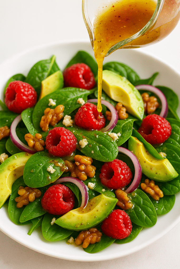 This easy raspberry spinach salad is made for you β crisp baby spinach tossed with sweet raspberries, creamy avocado &